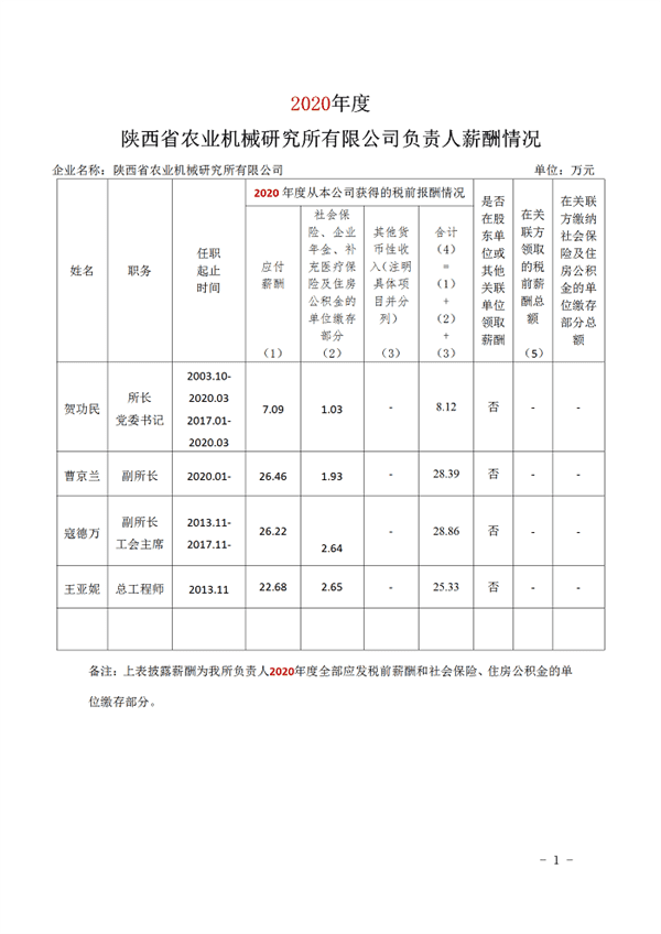 2020年度陜西省農業機械研究所有限公司負責人薪酬情況