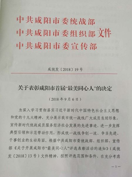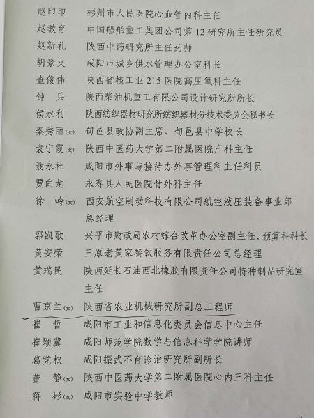 陜西省農業(yè)機械研究所副總工程師、質檢總站副站長、高級工程師曹京蘭同志榮獲咸陽市首屆“最美同心人”榮譽稱號。